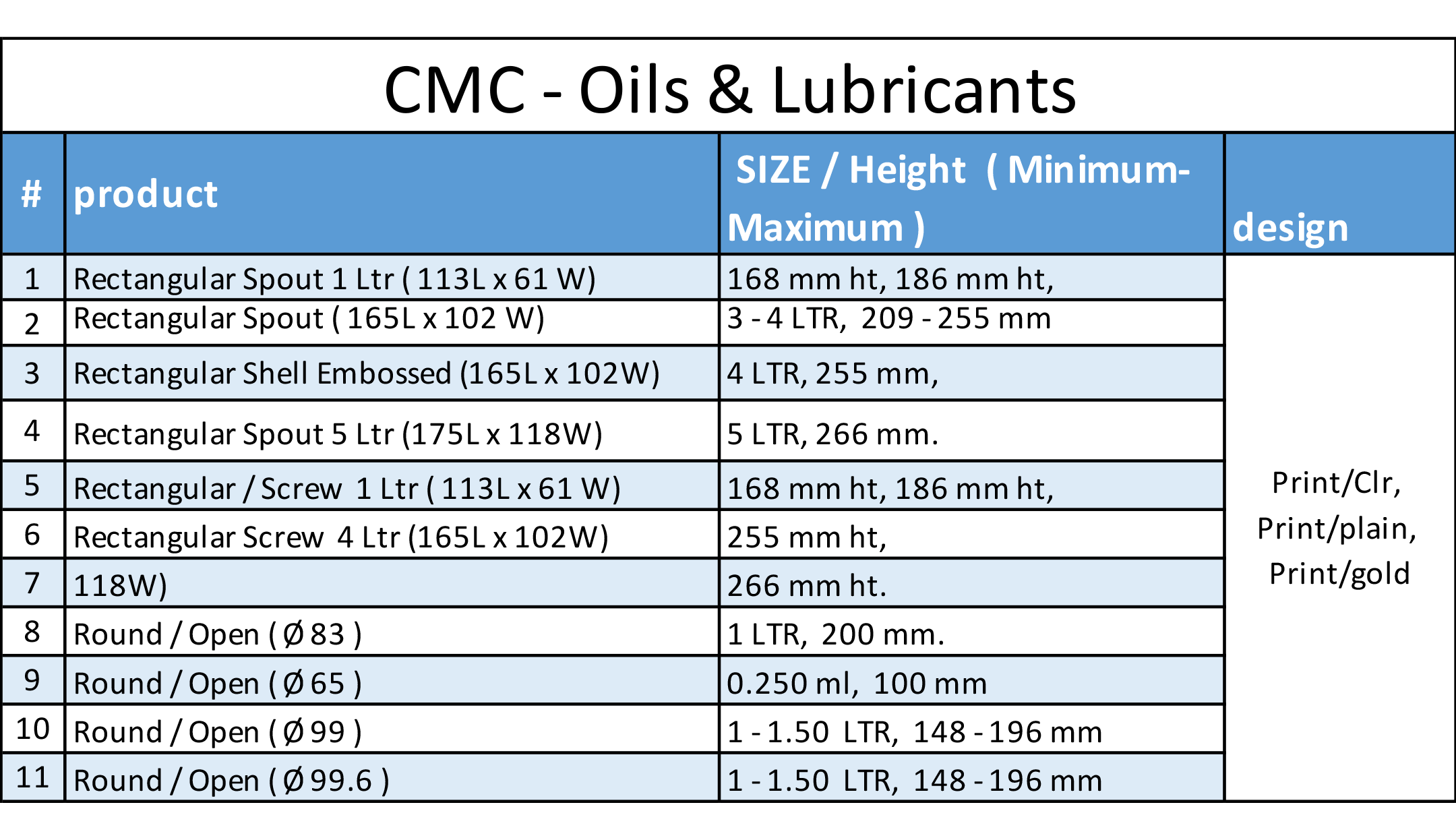 يتم تصنيع العبوات المناسبة لتعبئة المنتجات النفطية (الزيوت( مثل زيوت المحركات وزيوت التشحيم وغيرها.حسب الاشكال والمقاسات التالية